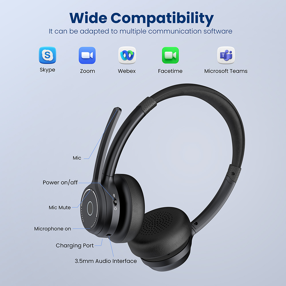 Bluetooth V5.4 & USB Dongle: The Bluetooth headset can let you experience the freedom and flexibility, offering two connection options: Bluetooth V5.4 and a USB adapter. Say goodbye to tangled wires and workspace clutter. The USB dongle ensures a secure, stable connection with low latency. Stay connected and productive even when you step away from your desk, without any signal loss concerns